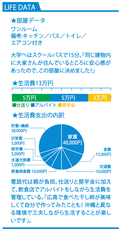 「イルカの魅力はショーだけじゃない。違う面から見たイルカの魅力を伝えられるようになりたくて、海洋学を学ぼうと決心しました」と進学した理由を話してくれた。幼い頃に祖父母が連れて行ってくれた美ら海水族館で見たイルカショーがきっかけで、海洋学の道に進んだという。東京都出身の母に連れられ、県外へ出る機会も多かった米須さん。沖縄以外の海、特に瀬戸内海を学んでみたいという気持ちがあり、福山大学への入学を決意。現在は4年生となり、海藻を研究対象とする研究室に属している。海洋学はもちろん、語学の勉強にも力を入れているそうで「中国語を学んでいると、どこか沖縄の方言に通ずるところがある。ルーツを感じて、すごく面白いです! なにかの魅力を人に伝えることが得意なので、それを活かして働きたいと思っています」と話してくれた米須さん。卒業後は人材サービスなどで、個人の魅力を企業に伝える、そんな仕事に就きたいと話してくれた。「笑顔で県外へ送り出して、全力で応援してくれた家族や友達を想うと中途半端な状態では帰ることはできない。しっかり成長して、胸を張って沖縄に帰ろうと思っています」